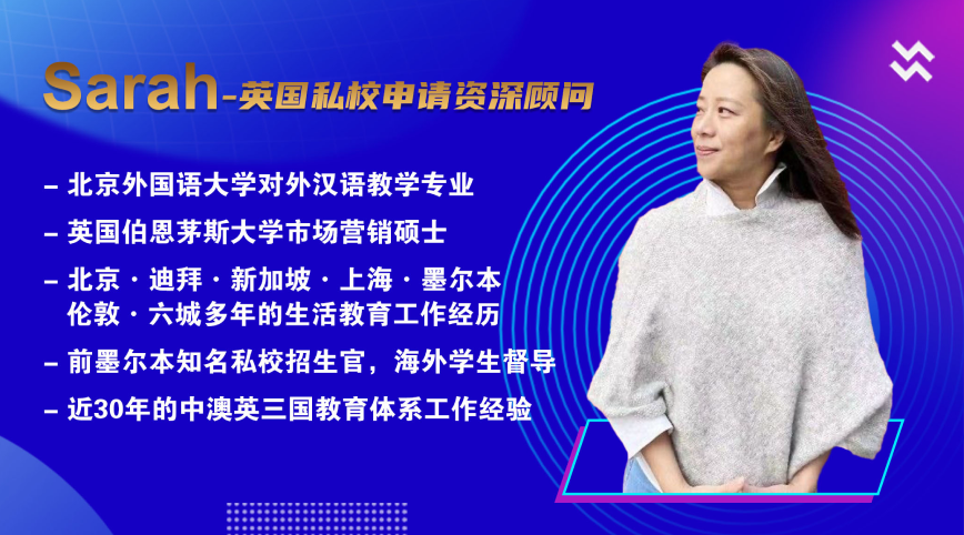 Sarah老师拥有走遍世界的丰富人生阅历,让她在中澳英三国的教育体系中游刃有余。在她为其混血女儿的澳洲小学、英国初中及高中的私校申请的亲身经历中,形成了独特的家长视野。Sarah老师擅长根据每个家庭的实际情况,定制个性化的英国低龄留学私校申请服务,同时担任过多年知名私校招生官的经历,让她非常擅长和申请学校的招生官之间高效沟通与关系维护。
