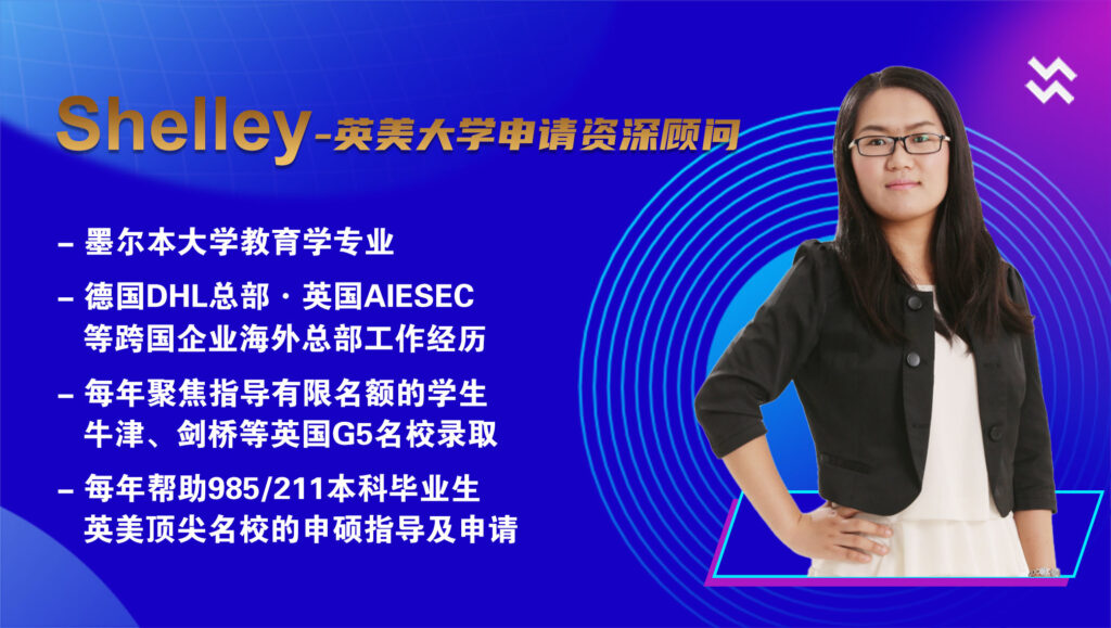 Shelley老师的英美大学指导申请业务的核心能力,最直观的表述就是她能通过文书等关键环节的优化与策划,在学生申请分数等硬件条件无法改变的前提下,提升学生申请时的软实力,从而帮助学生申请到自己心仪的世界名校。